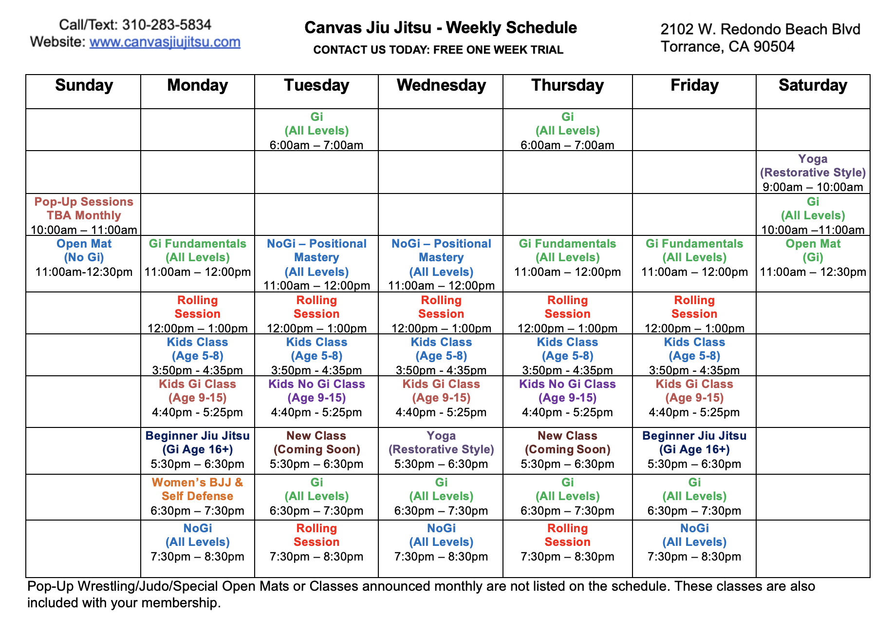 Pop-Up Sessions – This time slot rotates weekly and can range from age or gender specific open mats, to Judo classes, or other events. TBA monthly.